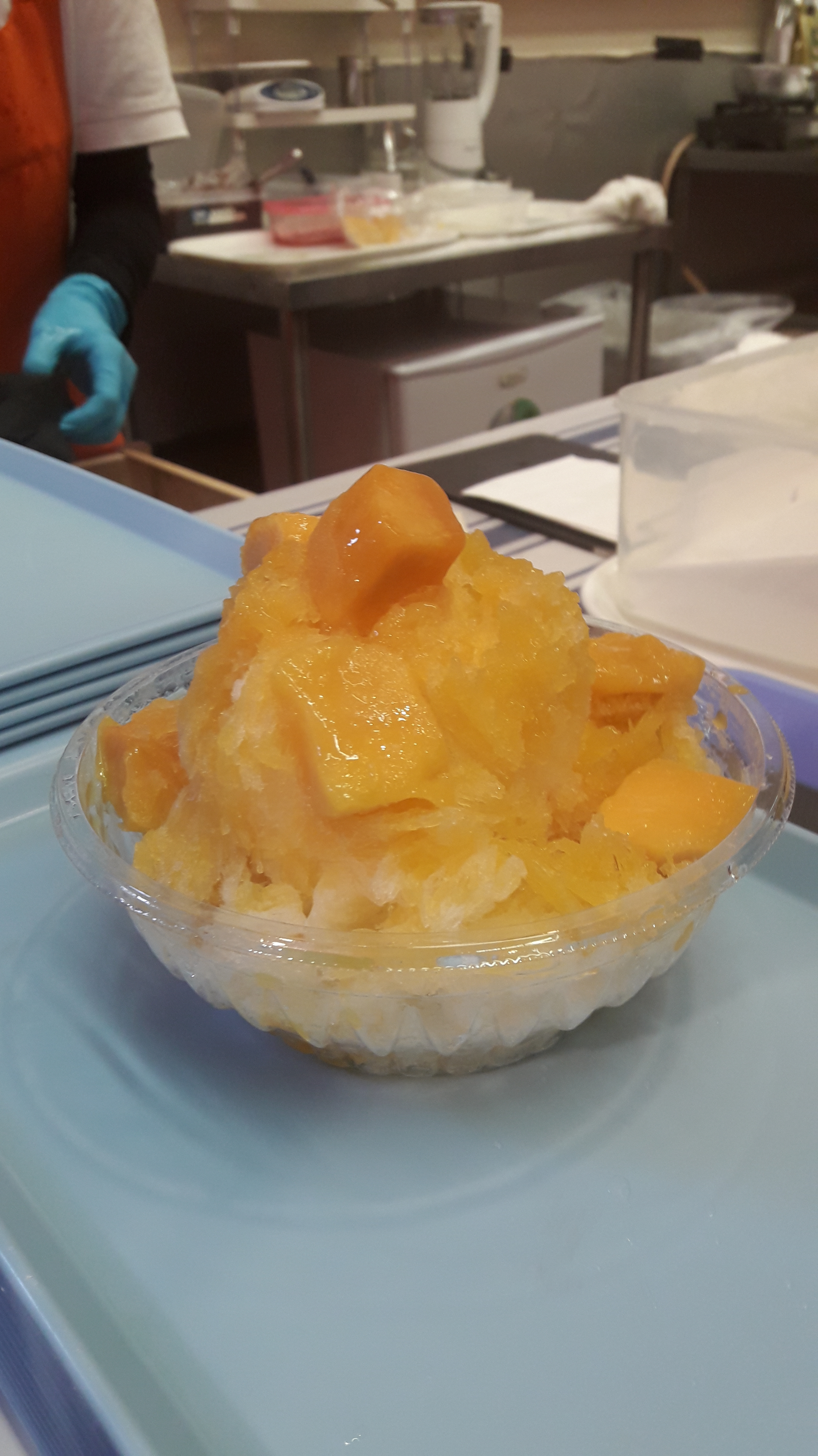 Japanese frozen treats: Lady Borden ice cream (left) and shaved ice topped with fresh ripe mangoes (right)