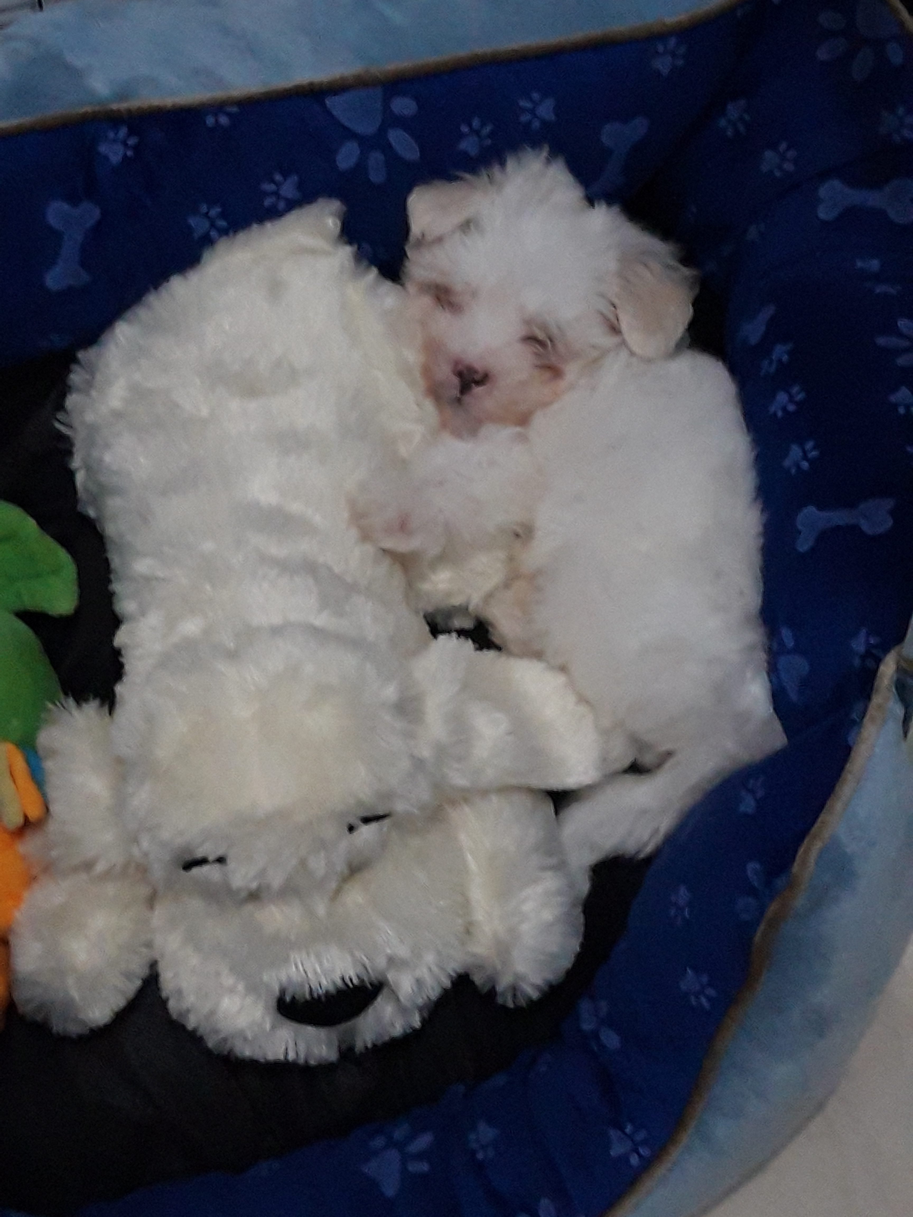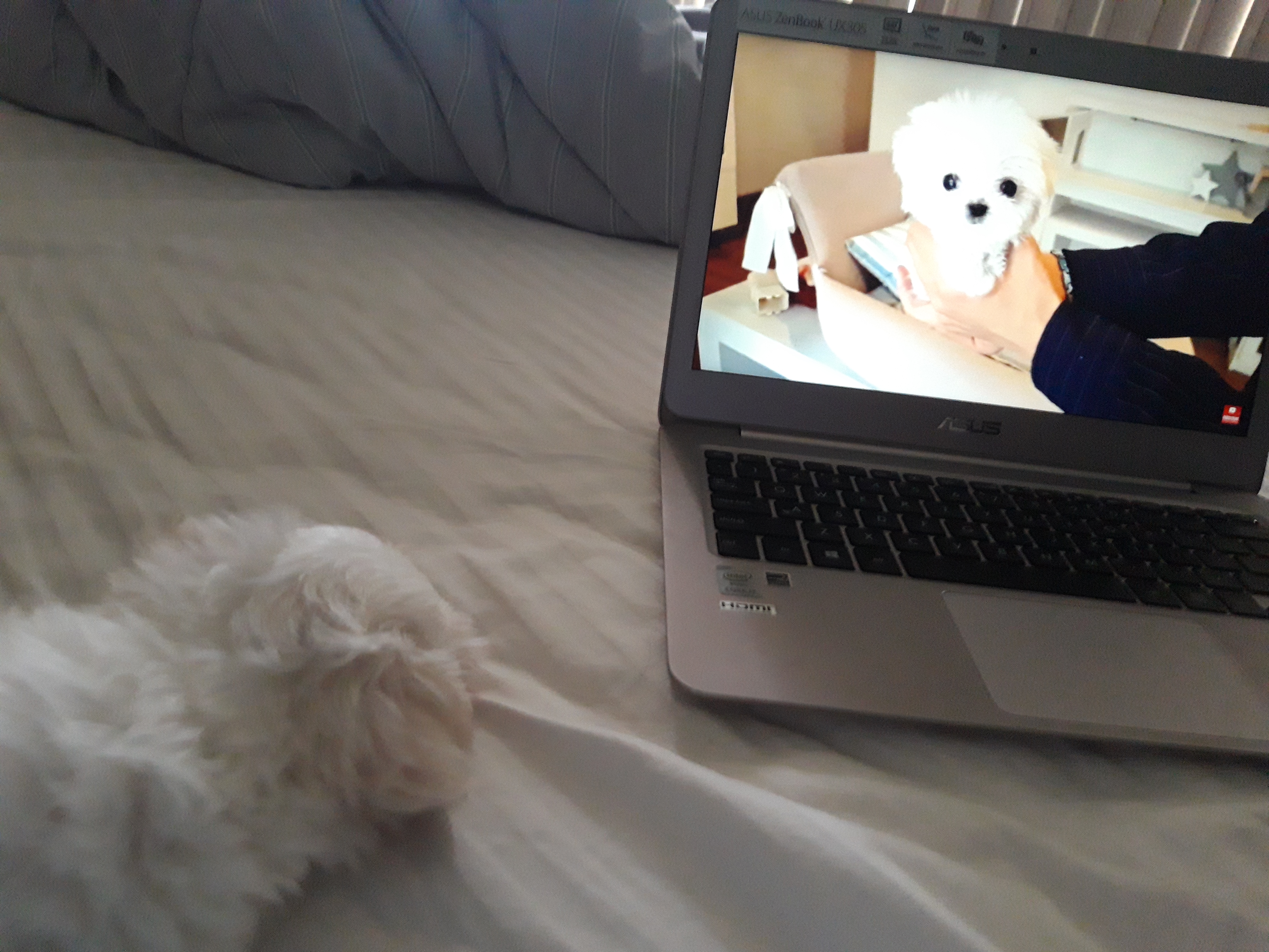 Top left (clockwise): Cotton in his bed of toys; licking my face; playing with his squeaky porcupine toy; snuggling in my comforter; watchin Youtube of Maltese pups; sleeping with his SmartPetLove Snuggle Puppy toy (with real-feel heartbeat for separation anxiety)