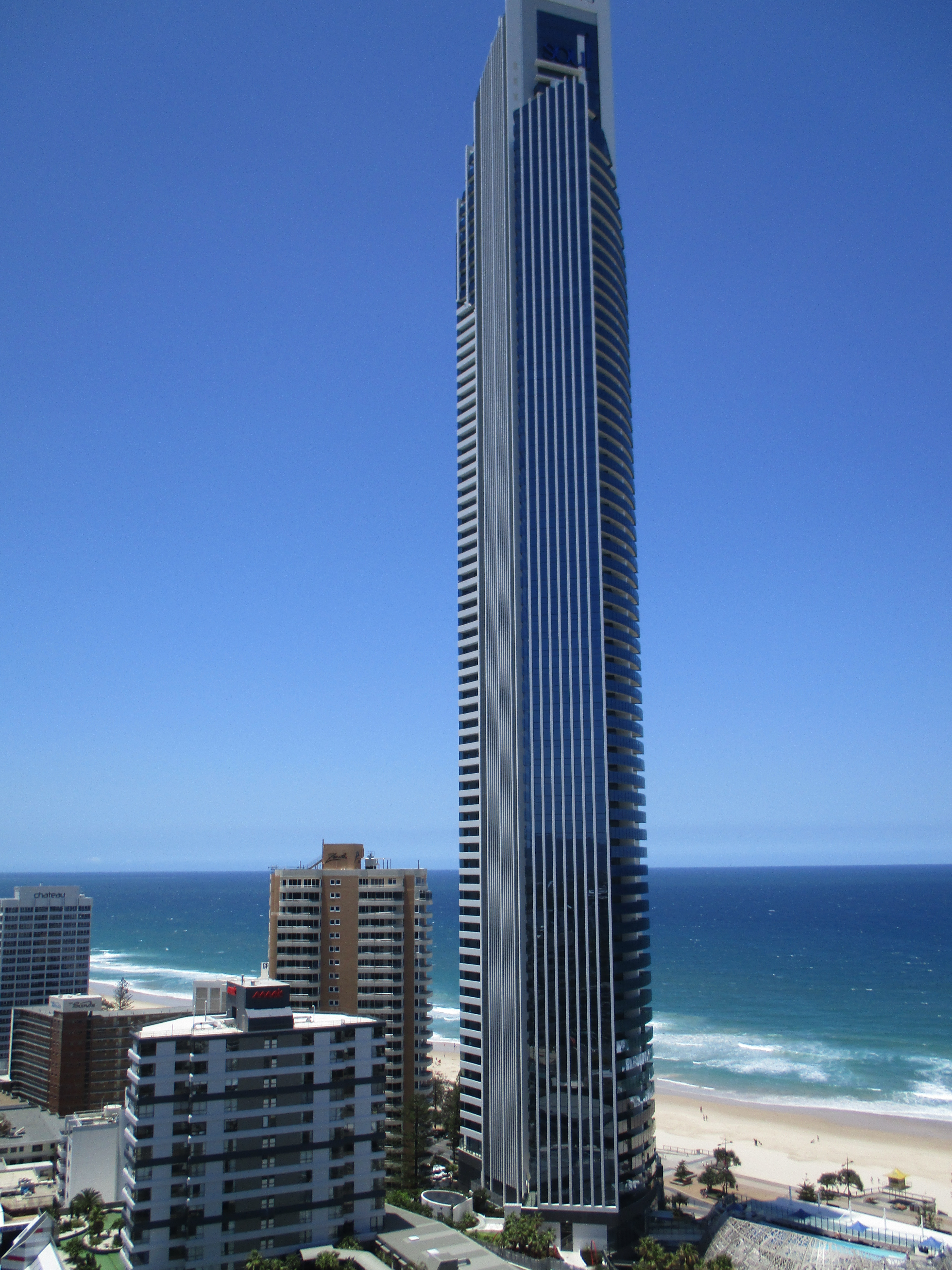 (Clockwise from top left) View of the Surfers Paradise Beach from my hotel room balcony; view of the skyscrapers from the beach; at the main entrance to the beach (Gold Coast, Australia)
