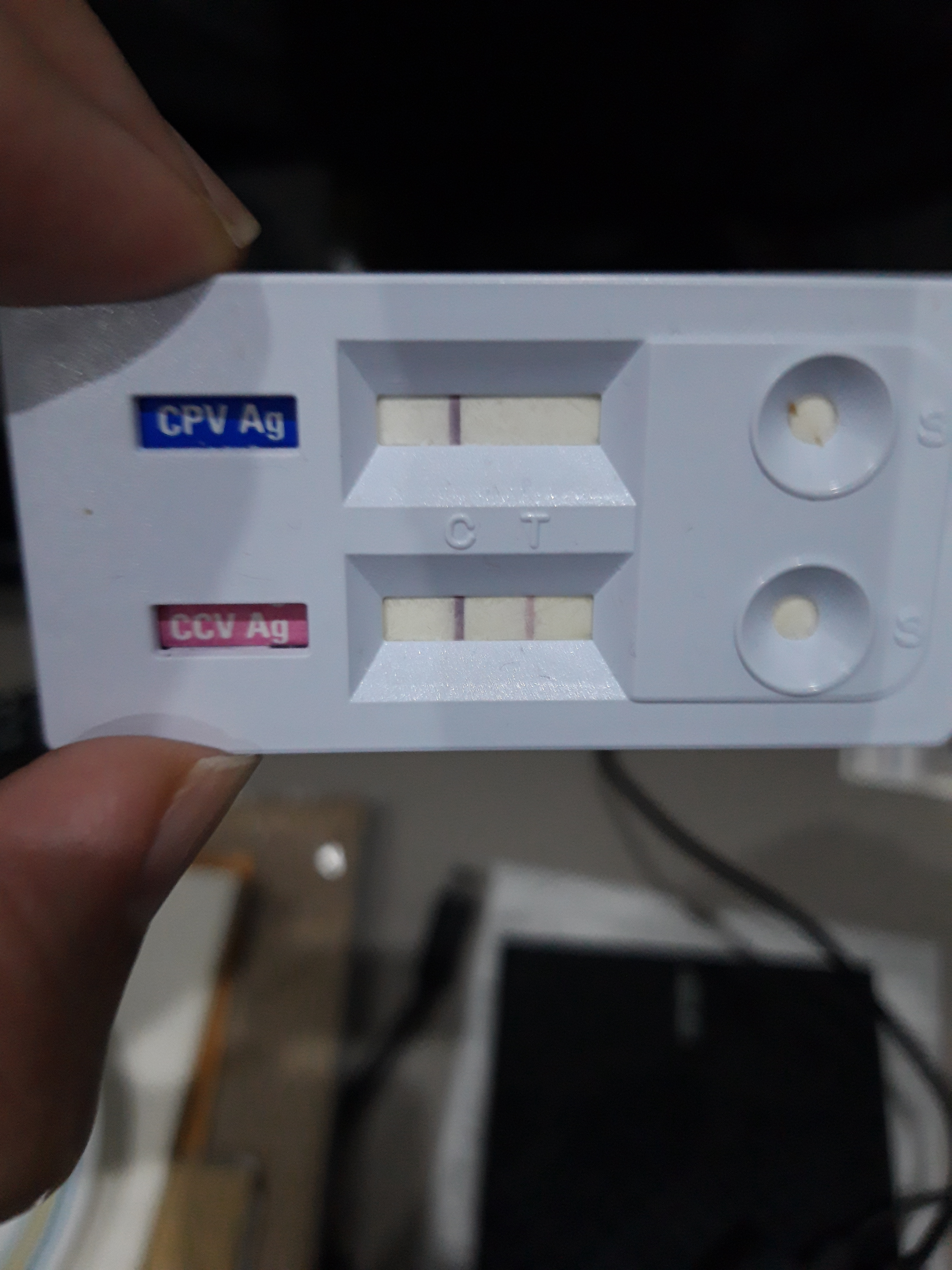Twin test results of Candy. Top bar is for parvovirus (single line means negative) and bottom bar is for coronavirus (double means positive).