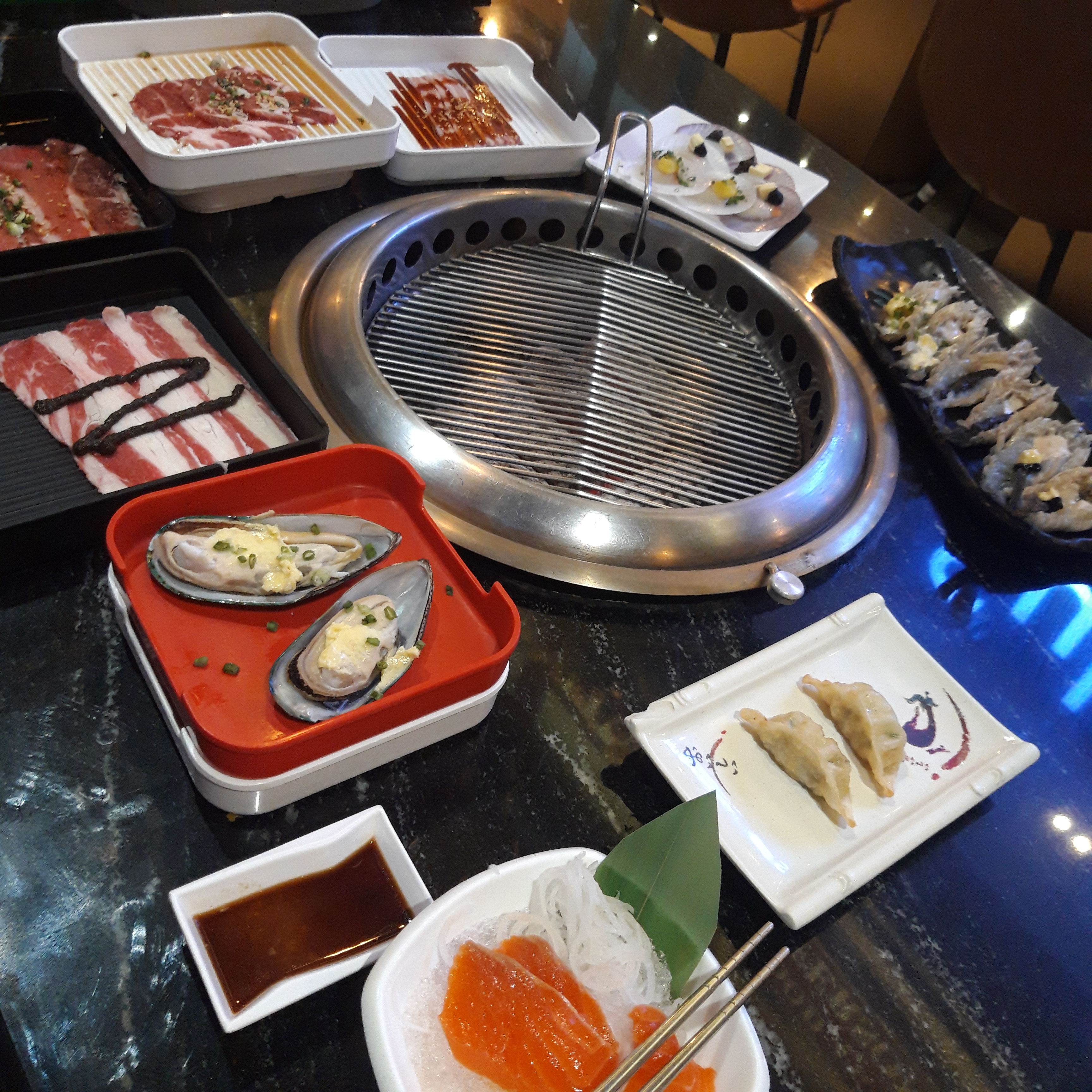 Korean Barbeque plus salmon sashimi and gyoza (see, even in a Korean resto, I still want my sashimi lol)