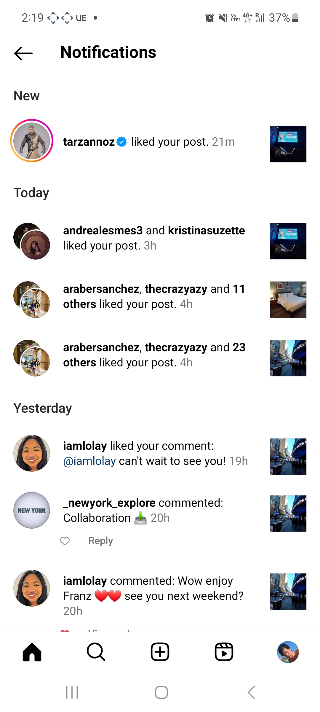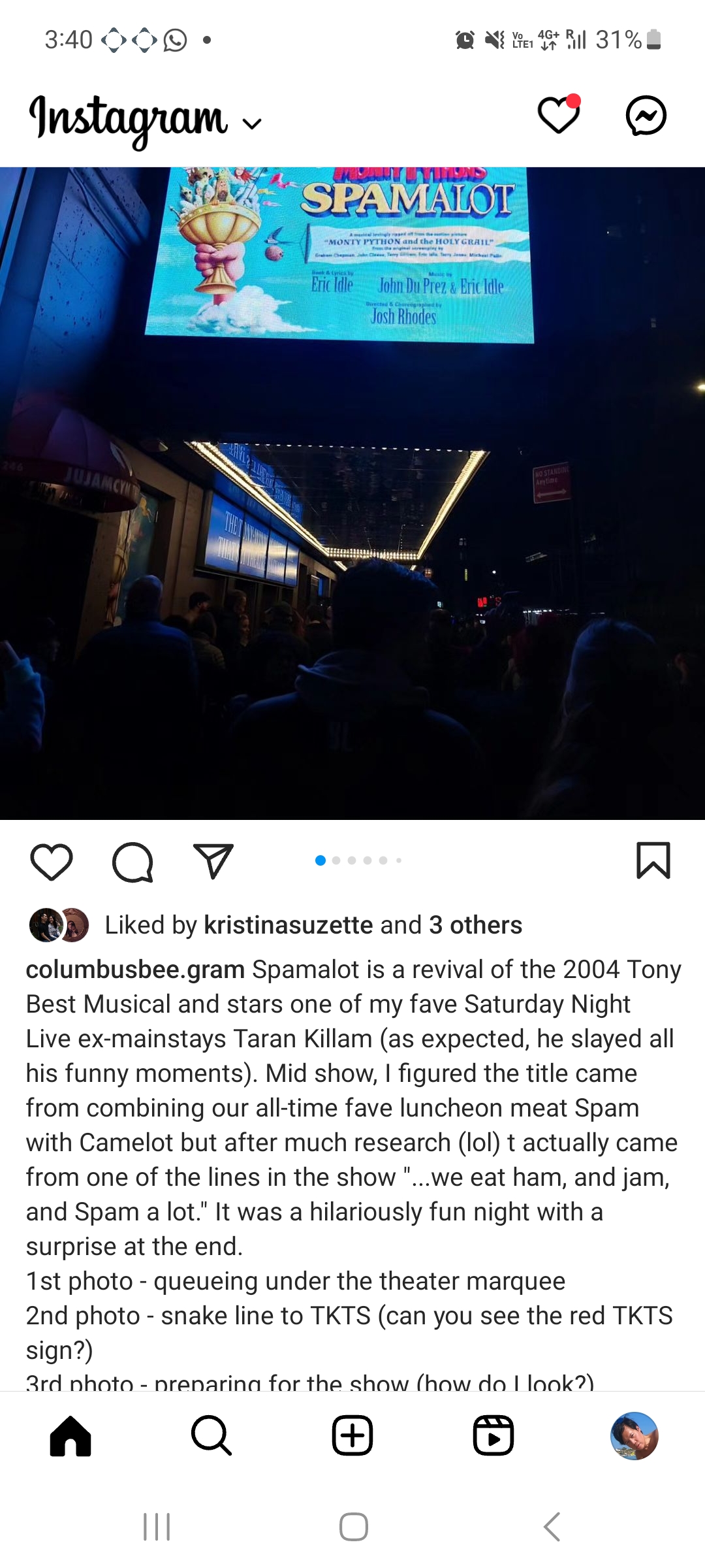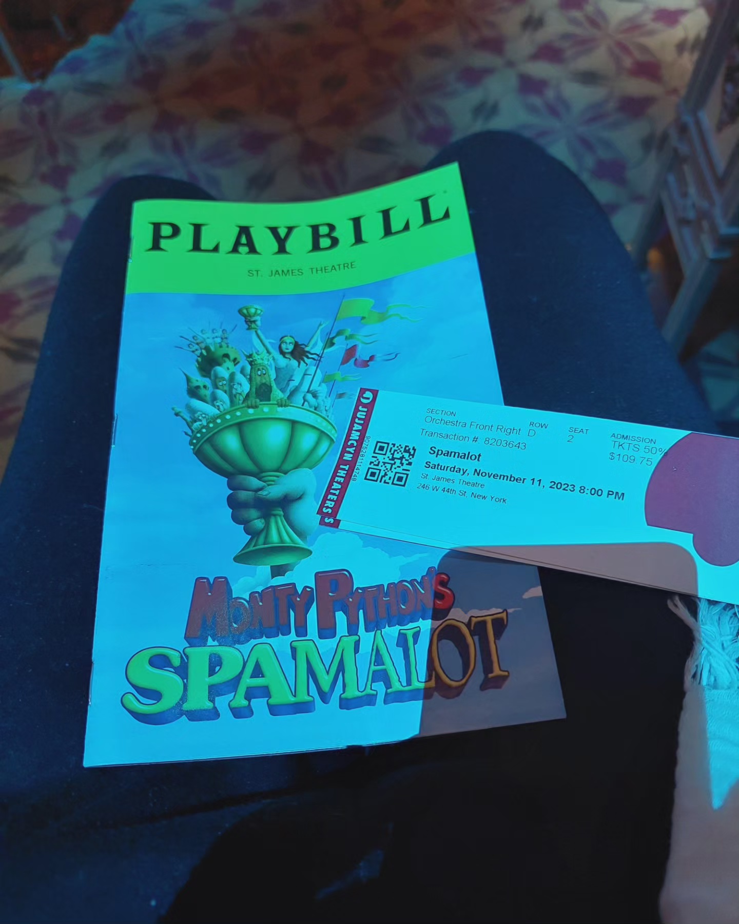 (Left to right): Instagram post on my review of Spamalot, Taran Killam (@tarzannoz) liking the post, show’s playbill and ticket, me during intermission