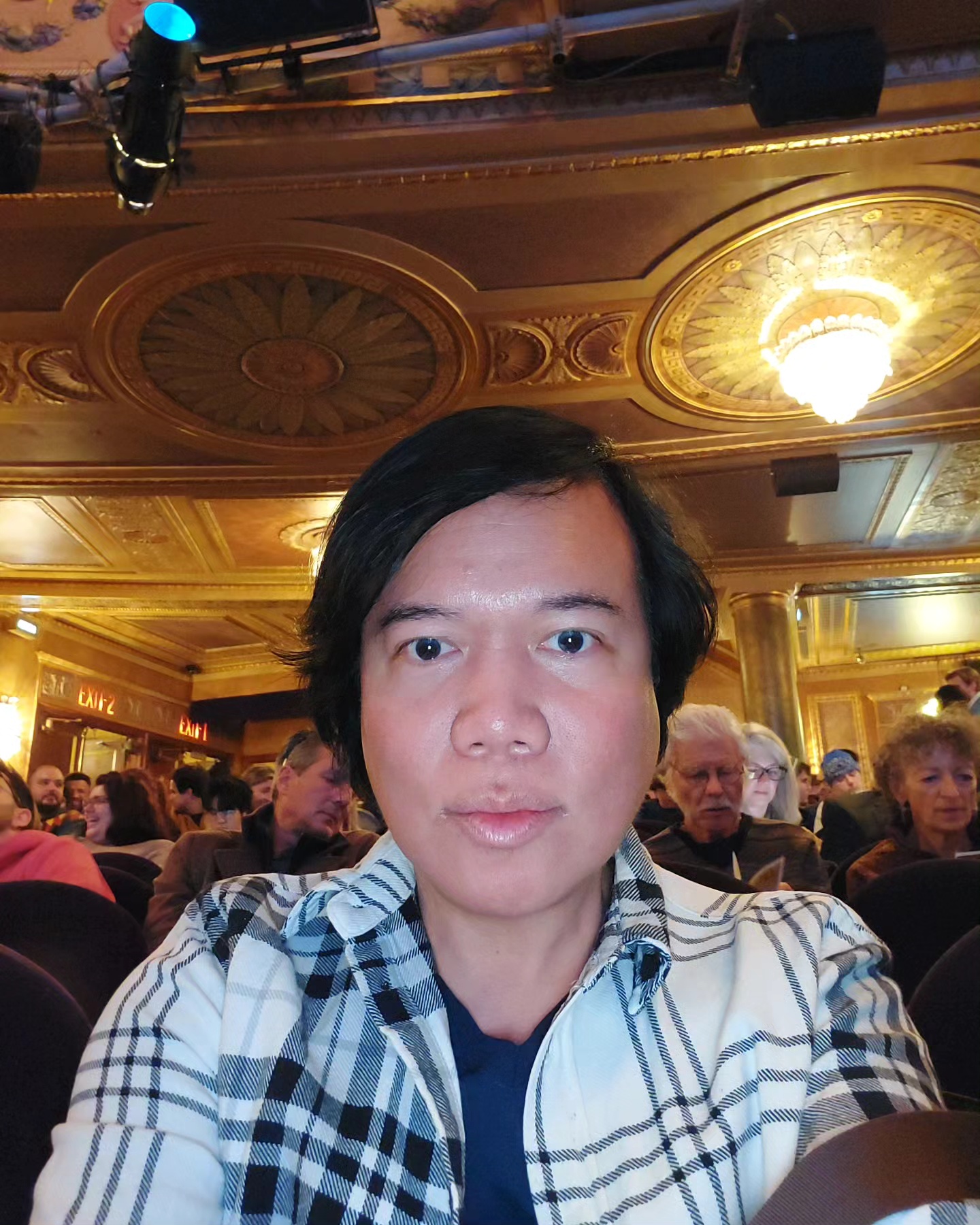 (Left to right): theater marquee, show’s playbill and ticket, me before the start of the show