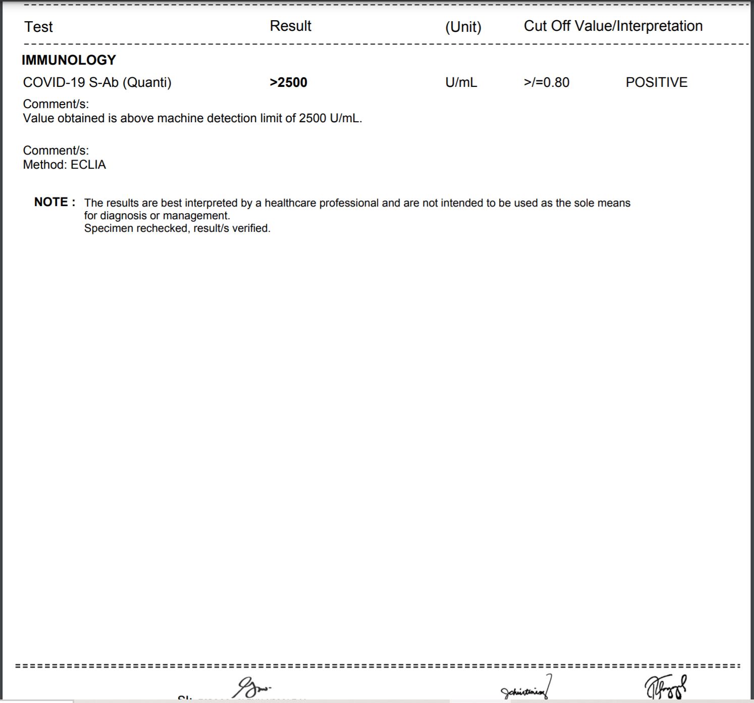 Per Dr Been, the protective threshold level for RBD is 100 U/mL. However, such level is based on another quantitative technique called ELISA or Enzyme-linked Immunosorbent Assay. Though there’s a study which results show that there is no significant quantitative correlation between the two testing techniques, I would like to think that since the two are the most commonly used techniques to detect antibodies, the RBD ELISA protection threshold level of 100 U/mL may still be applicable to ECLIA given that at the end of the day, both tests measure the amount of specific antibodies in the blood, which in this case are the high-affinity antibodies to the SARS-CoV-2 spike (S) protein RBD..